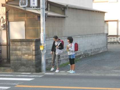 週末です。信号待ちをする児童と登校中に蛇を捕まえたといってみせる児童です。