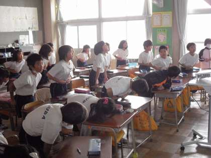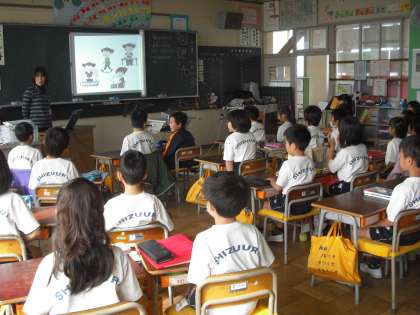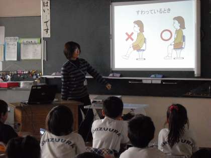 体重測定に続いて、竹内養護教諭から姿勢についてのお話がありました。良くない姿勢をしていると、神経や内臓、血管がつぶされてしまうことに、子ども達はとても驚いていました。