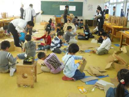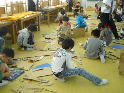 3年1組図工科「クミクミックス」の段ボールを素材とした授業です
