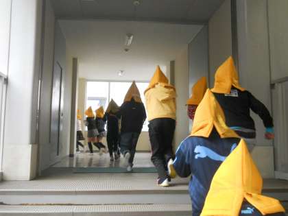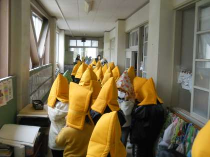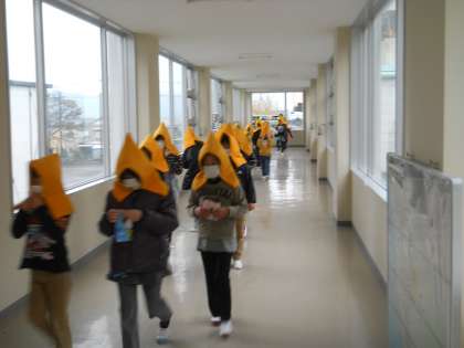 訓練・訓練・・・ただいま家庭科室から火災が発生しました。児童は、先生の指示に従って、すばやく体育館へ避難しなさい!