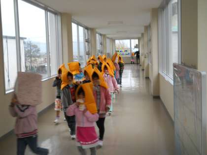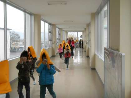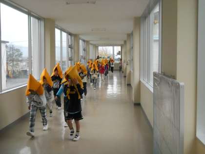 児童は、先生の指示に従って口をハンカチ等でおさえて避難です。