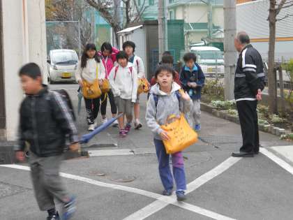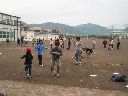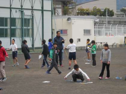 登校中の児童や運動場で縄跳び運動をする児童です。