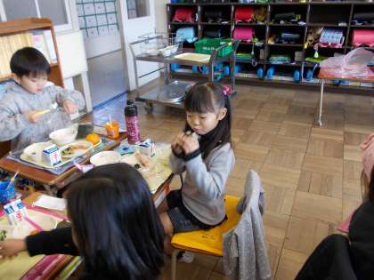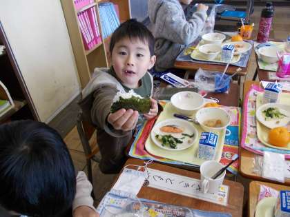 1年生の教室へ・・・上手におにぎりをつくれたよ。