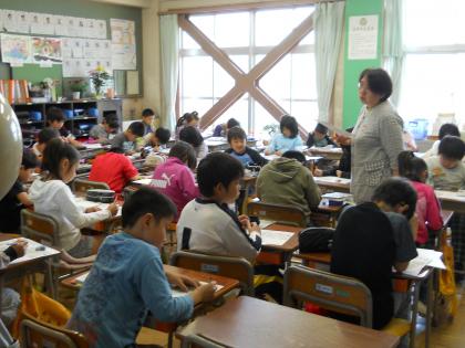 先生の問いに手をあげて答えます。また、黒板の前に行って答えます。
