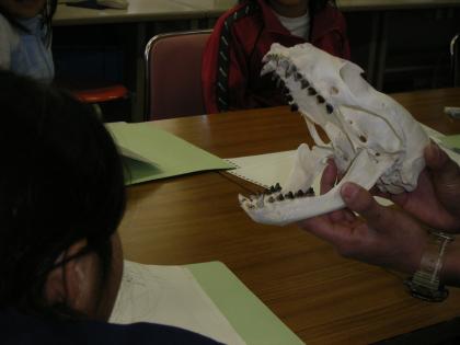 4年生は、マナビの時間に、身近な海にいる生物に興味を持ち、シーパラダイスではどんな生き物を飼育しているのか調べることにしました。百科事典やシーパラダイスのホームページから、興味のある生き物を見つけ、意欲的に調べ学習に取り組みました。今回は、調べても分からなかった疑問に答えていただく講師として、三津シーパラダイスの職員の方に来校いただき、いろいろなお話を伺うことができました。大変貴重なカリフォルニアアシカの頭蓋骨を見せていただきました。本物の迫力にびっくりしました。