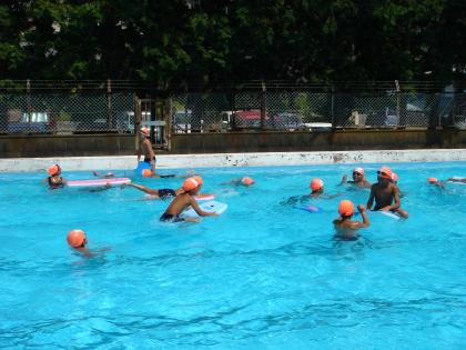 気温32℃、水温29℃ プール開放2日目。本日も50名以上の児童が参加しています。ボディボードを使ったり、ビート板を使ったりして、楽しんでいます。