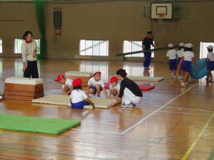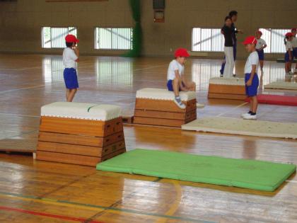 みんなで準備をして、これから跳び箱、平均台を使って勉強をします。