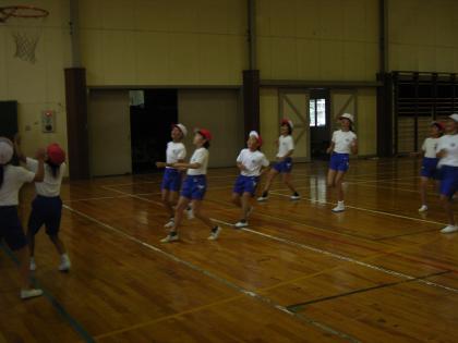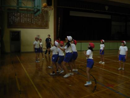 5年生の体育。2校の子どもたちがそれぞれチームメイトになって、バスケットボールの試合です。何となく、気恥ずかしそうにパスしてるかなあ・・・。