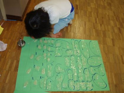 大きな数の学習をしていました。お米を使ってひとりひとり、まとまりを考え数えながら学習していました。