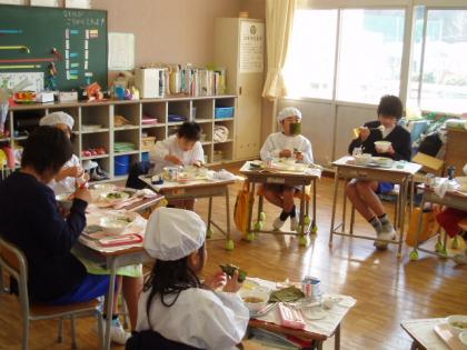 6年生が、各教室にて給食を食べています。
