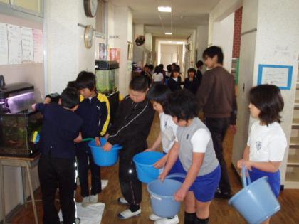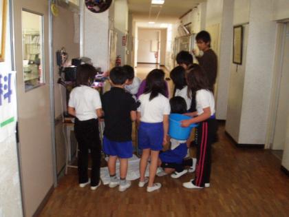 3年生が2年生に、水槽のお世話の引き継ぎをしています。