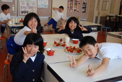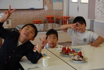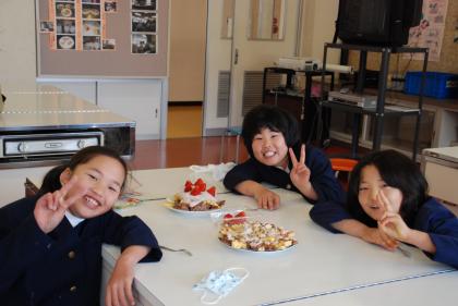 お楽しみ会でチョコレートケーキを作りました。ホットケーキの生地にココアパウダーを混ぜたりチョコレートをとかしてかけたりしました。おいしくできました。
