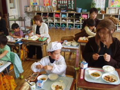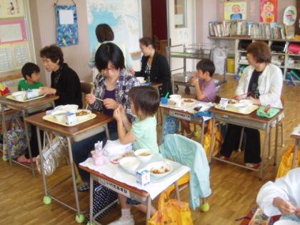 1年生の保護者に、給食を食べていただいています。いつも児童が食べている給食を、親子で味わっています。