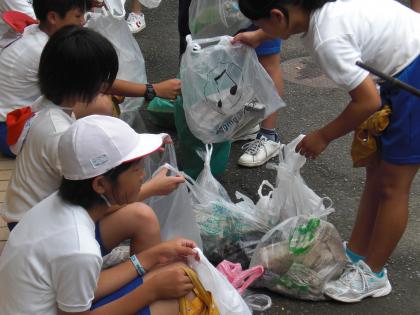 たくさんのゴミを拾い帰校します。ゴミの分別を、帰校してから6年生がしています。