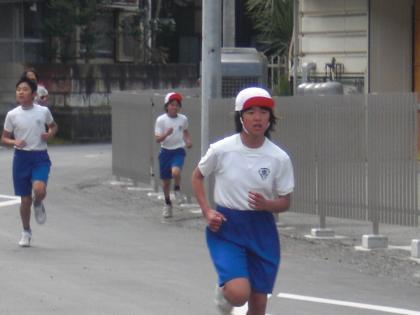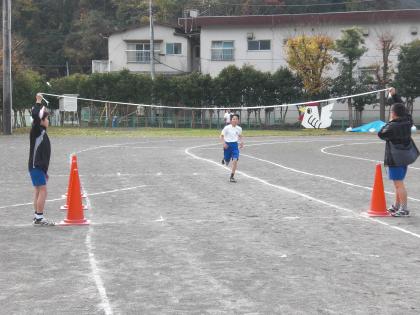 先頭でゴールする6年渡辺さんと2位の佐藤さんです。3位につけている5年綾部さんです。