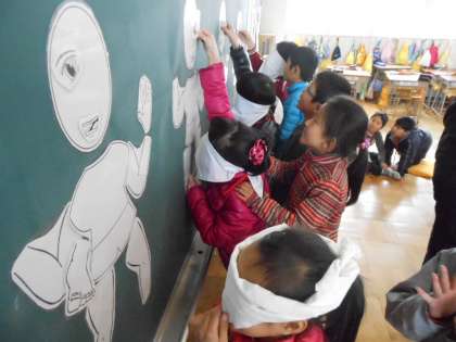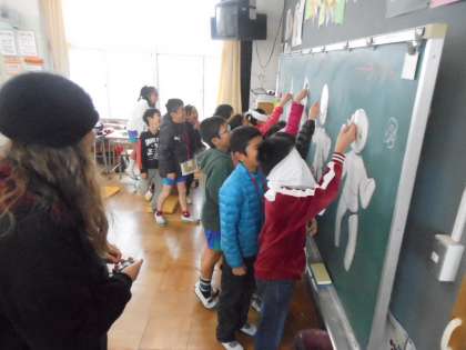 「右・左・前・後ろ・上・下」などの言葉を英語で言って、福笑いをしました。
