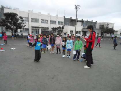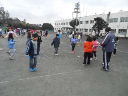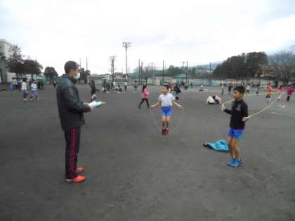 運動場では、縄跳び検定を見てもらおうと、子どもたちが先生のまわりに集まっていました。