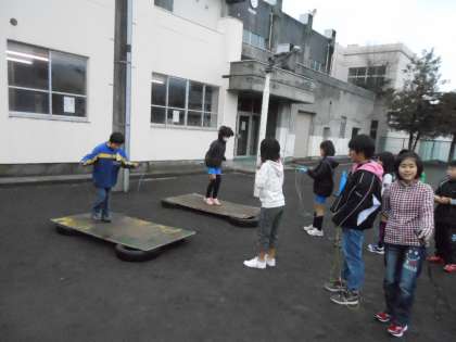 ジャンピングボードはいろいろな学年の子どもが列を作っていますが、『ひっかかたら交代』というルールができていて、スムーズに流れていました。