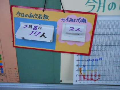 先週末9名だったインフルエンザ罹患者は、今週になって減少しました。しかし、木曜日、金曜日とインフルエンザ罹患者数が少しずつ増えたり(写真では2名ですが、その後の連絡で4名になりました)、発熱による欠席者が増えたたりしています。