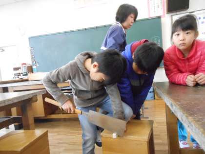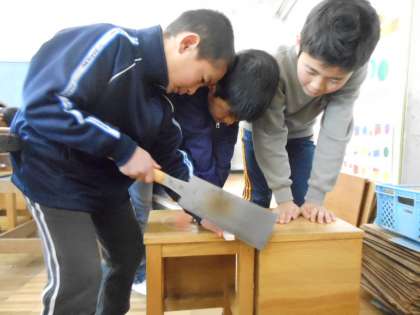友達に棒を押さえるのを手伝ってもらって、がんばって切りました。