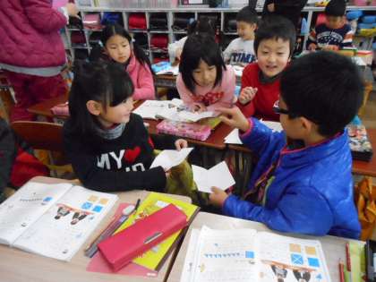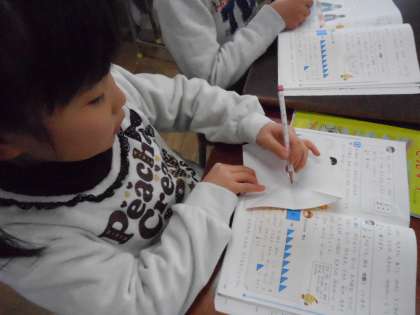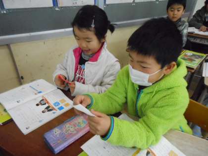 折り紙を使って、2つに分ける、4つに分ける方法を考えながら、1/2,1/4の勉強をしました。