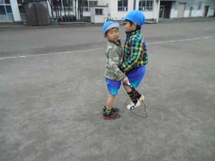 二人で手をつないだり前後に並んだりして、ペアの子と息を合わせて跳んでいました。