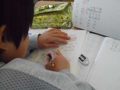 直方体の面と辺の垂直と平行の関係について学習しました。面と面、辺と辺の関係は分かるけれど、面と辺の関係になると難しくなってしまいます。