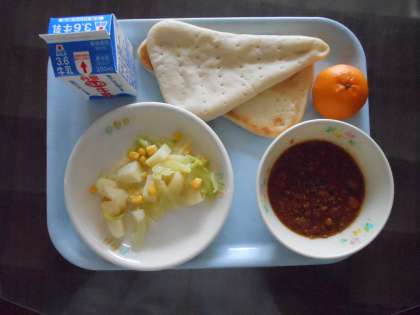 今日の献立は、「キーマカレーとナン、ポテトサラダ、牛乳」それに、デザートは「ぽんかん」です。