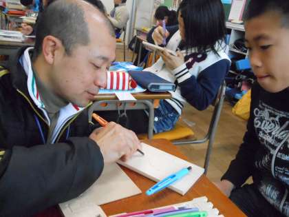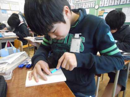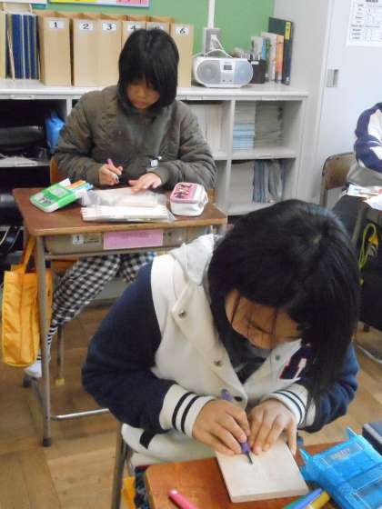 お宝ボックスを作っています。ふたや側面にデザインをして、彫刻刀で彫っていきます。こつこつと根気のいる作業ですが、小学校最後の図工作品、楽しく作っています。