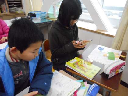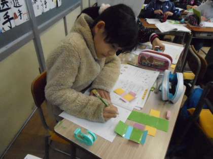 どの長方形を何枚使ったら直方体ができるかを実物をつかって学習しました。同じ色同士が向き合うことが分かっているので、スムーズに作ることができました。直方体もこれで終わりです。