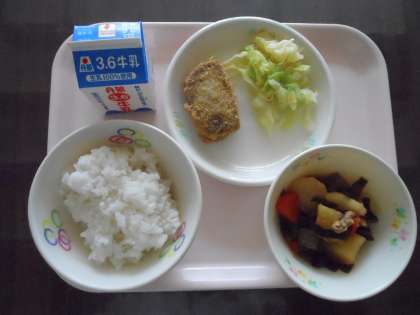 黒はんぺんチーズフライのほかに、鶏肉と野菜の旨煮、ボイルドキャベツ、牛乳、ごはんです。