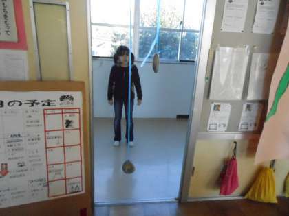 『重い石をつけた長いひも』と『軽い石をつけた短いひも』とでどちらがゆっくりか振れるかを予想したあと、確かめました。