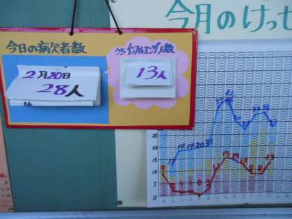 インフルエンザ罹患者は10名前後、風邪様疾患の欠席者は20後半〜40名で増減しています。