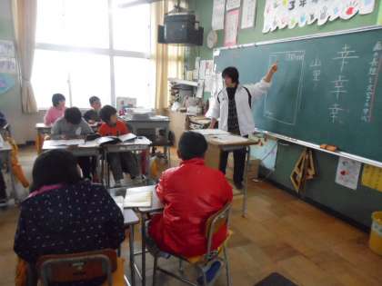 画の長短に気をつけ、文字の中心をそろえて書く練習のまとめとして、はがきの表書きの書き方を学習しました。