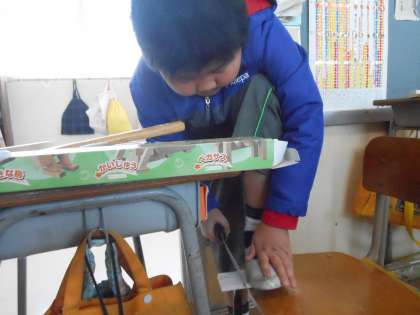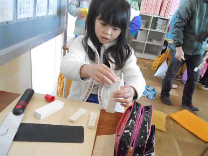 だんだん作品ができあがってきました。のこぎりの使い方、釘の打ち方も上手になってきました。