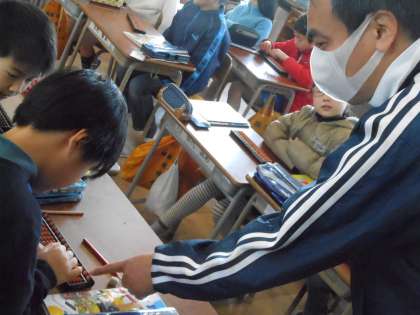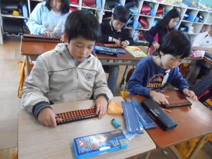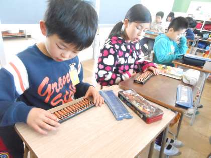 そろばんで、玉の置き方や数の読み方を確認した後、たし算やひきひき算を行いました。