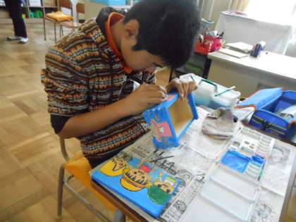 6年生のお宝ボックスは、もうすぐ完成です。色を塗ったあと、マジックで縁取りをしています。
