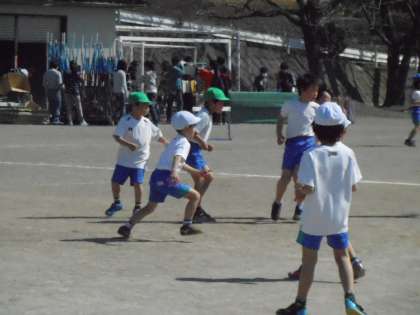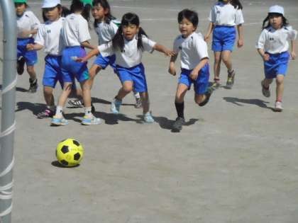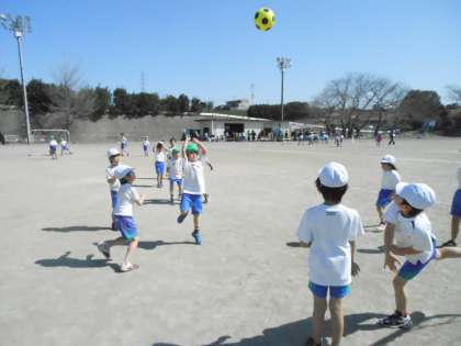 ラインなしミニサッカーをやりました。はじめは、立っているだけだった子も、回を重ねるたびに、動けるようになってきました。一生懸命ボールを追いかけ、汗をいっぱいかいていました。