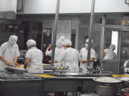 徐々に暑さが増してきました。今週も朝から調理場では、子どもたちにおいしい給食を食べてもらおうと、調理師たちが忙しく調理しています。