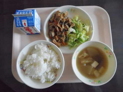 5月13日のメニューは、子どもたちに人気メニューのひとつである『スタミナやきにく』をはじめ、「けんちんじる、ボイルドキャベツ、ぎゅうにゅう、ごはん」でした。
