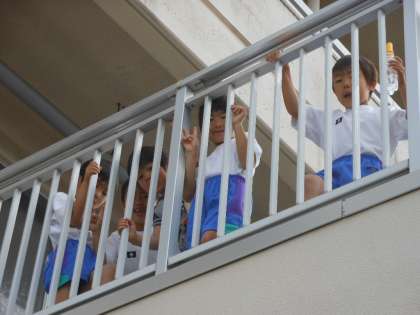 1年生は、アサガオに水をやるために、教室前のベランダに出ていました。「アサガオの芽が出たよ〜。」と教えてくれました。