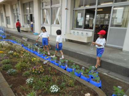 2年生は、先週植えた野菜に、水を与えていました。「もう、ミニトマトが花を咲かせたよ。」と教えてくれました。