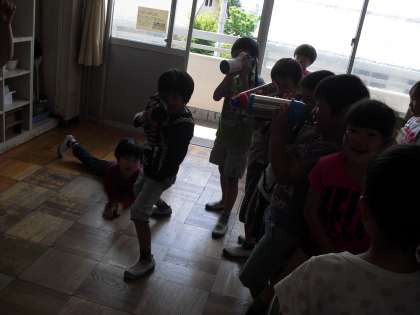 「ぼくたちが写真をとるよ!」と水とうのカメラを持ったカメラマンたちが登場!