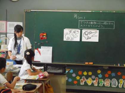 5つの動物の中で、どの動物が一番大きな口を開けているのかを三角定規をあてながら、調べました。分度器を使って調べようとしている子もいました。