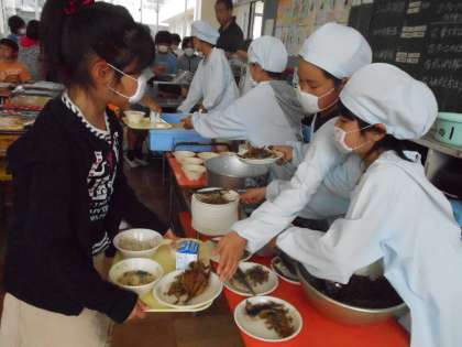 教室では、係の子どもたちが手際よく配膳をしていました。