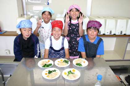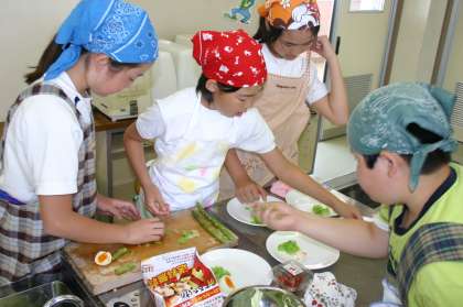 ゆで野菜を使った料理作りに挑戦しました。班のみんなと協力して、手際よく進めることも目標でしたが、なれない作業に戸惑う場面も…。しかし、何とか完成し、おいしく食べることができました。