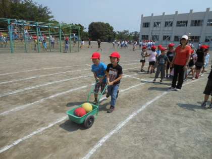 1年生は玉入れ、2年生はふしぎなたまごの宅急便、3年生はトルネードの練習です。
