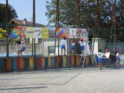 児童会の子どもたちは、クラスで分担して作ったスローガンをバックネットに掲示しました。