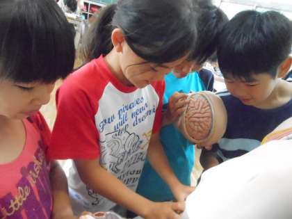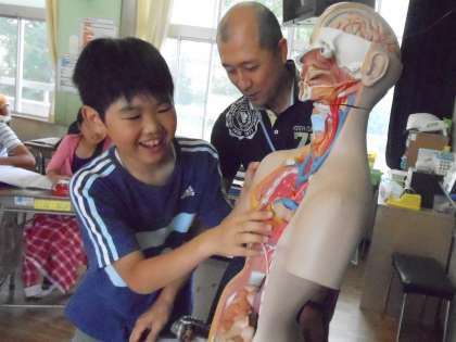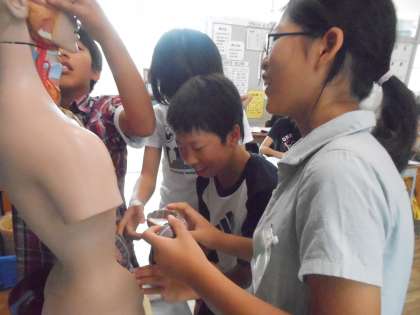 口から入った食べ物がどこを通っていくのかな。模型を使って胃や腸の様子を調べました。それぞれの臓器の役割をこれから学習していきましょう。
