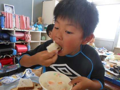 ほきフライやスープをつけたぶどうパンを、がっつりと食べています。
